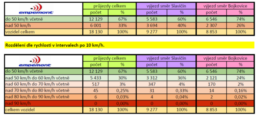 u obecního úřadu. Obcí projelo za týden 18.130 vozidel, z toho 33 % vozidel (6001) nedodrželo v daném úseku rychlost, z toho 5433 vozidel bylo v rychlosti mezi 50 – 60 km/h a 568 vozidel nad 60 km/h. Nejvyšší rychlost byla dosažena v poledne v pracovní den, a to 87 km/h. Výsledky analýzy i situace na dolním konci a ke hřišti byla předána projektantovi ke zpracování projektu a posouzení situace. Protože frekvence přestupků není taková, aby mohlo dojít ze strany dopravní policie k instalaci stálého měření, tak projektant navrhl umístění ukazatele měření rychlosti ke křižovatce k mateřské škole a z druhé strany ke kulturnímu domu, abychom zklidnili dopravu mezi mateřskou školou a základní školou a upozornili řidiče na zvýšený pohyb dětí. Zároveň projektant navrhl umístění bodových prahů na obě místní komunikace, na dolní konec ke kontejnerům a mezi Kút a sportovní areál. Dokumentace byla následně předložena ORP Uherský Brod a k posouzení dopravní policii ti tento záměr v prosinci 2025 schválili. V současné době proto konečně připravujeme instalaci všech tří bezpečnostních prvků.